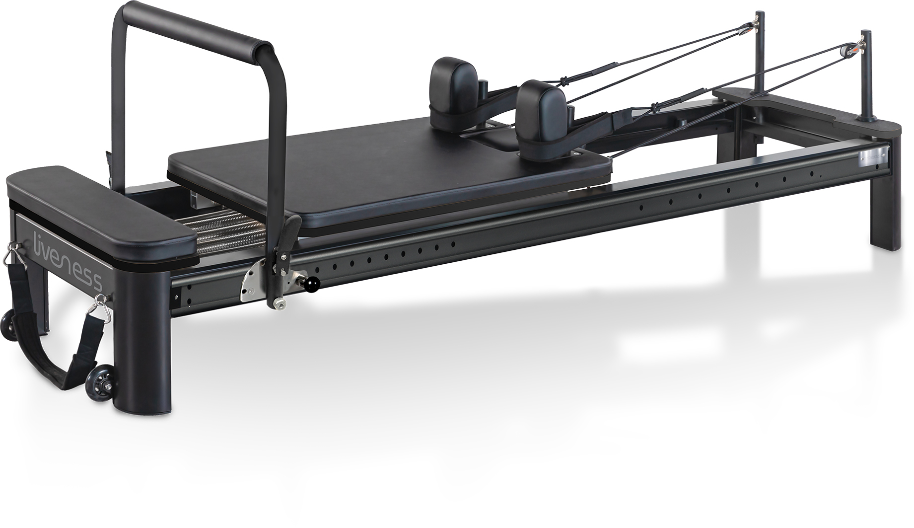 TIP NAPRAVE: Pilates reformer (profesionalni)NAMEN UPORABE: Profesionalna in polprofesionalna uporaba (studii, fizioterapija, intenzivna domača uporaba)OKVIR: AluminijVODILA: Polna aluminijasta vodilaVOZIČEK: 8 PU koles z ležaji za gladko in tiho delovanje. Dimenzije: 600 × 943 mm. Dolžina hoda: 1030 mm. Višina od tal: 389 mm.NASTAVITEV FOOTBAR (OPORNA) PALICE: 5 kotnih stopenj, 19 horizontalnih nastavitev